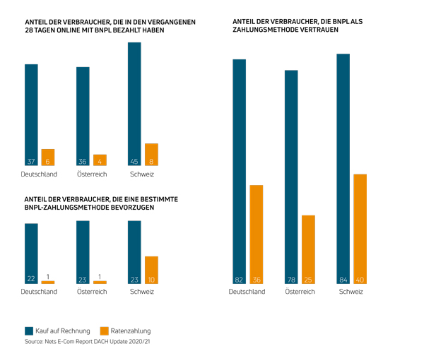 For historical and cultural reasons, BNPL is already widely adopted in the DACH region. Data from the Nets E-Com Report DACH Update 2020/21 reveals that 37% of Germans opt for invoicing and 6% choose installment payments for online purchases. One reason for this is undoubtedly the high level of trust enjoyed by this payment method in the DACH region, as indicated by 82% of German, 78% of Austrian, and 84% of Swiss consumers (see Figure 1).